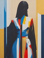 Een kunstwerk met minimalistische lijnen, gedomineerd door wit, rood, blauw en zwart, met een abstract portret van een vrouw, kan worden beschouwd als een combinatie van minimalistische kunst en abstracte kunst. Deze stijl wordt vaak gekenmerkt door eenvoudige vormen, beperkt kleurenpalet en abstracte weergave van de vrouwelijke vorm.
