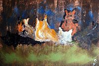 Uitkijkend over het land moest ik denken aan alle katten die bij ons hadden gewoond en in gedachten stelde ik me voor dat ze nog steeds bij ons waren in de geest, zonnebadend als een groep. Dus schilderde ik dat tafereel. Het is een fijne gedachte dat ze nog steeds bij ons zijn en vaak op bezoek komen.