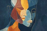 Een modern minimalistisch kunstwerk waarin twee gestileerde gezichtsprofielen samensmelten in een harmonieus spel van warme en koele tinten. De compositie wordt gekenmerkt door vloeiende gouden lijnen die de contouren vormen tegen een diepblauwe achtergrond, waarbij organische vormen in terracotta, okergeel en turquoise elkaar overlappen en een gevoel van intimiteit en verbondenheid creëren.