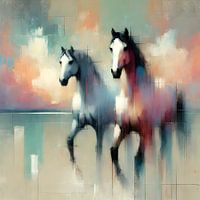 Een verfijnd modern werk in pasteltinten met twee paarden op een zacht glooiend strand. De zachte kleuren van de lucht en zee smelten samen in een dromerige achtergrond. De paarden stralen harmonie en verbondenheid uit, hun silhouetten subtiel omlijst door het warme licht. Een delicaat werk dat rust en tederheid oproept.
