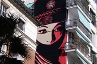 Muurschildering tussen een paar flats in de stad Malaga in Spanje. De gesluierde vrouw kijkt vanaf grootte hoogte op je neer.