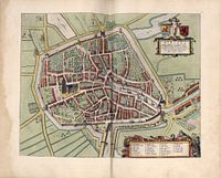 Oude kaart, Plattegrond, index en wegenkaart van de stad met de verdedigingswerken, wateren, pleinen en markten. Verder de kerken, windmolens en stadsmuur of stadswal.