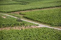 Weggetjes lopen zig zag door een Franse wijngaard. Wijn, wijnstok, Frankrijk, vakantie