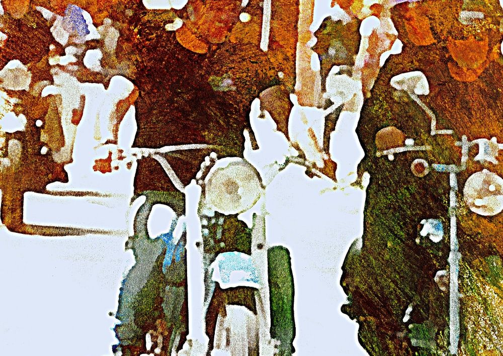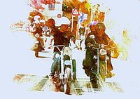 Een groep Italiaanse motorliefhebbers rijdt zij aan zij door een Italiaanse stad. Iedereen ziet eruit alsof ze plezier hebben!