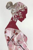 Silhouetvorm van een vrouwelijke figuur, afgebeeld in profiel en opgebouwd uit een collage-achtige structuur van bladvormen en takken. De contouren zijn strak en elegant, met een diepe bordeauxrode kleur als basis, waarin natuurmotieven subtiel verwerkt zijn. Vooral in het haar en op de schouders groeien bladeren als een organisch patroon mee met de vorm, wat de suggestie wekt van verbondenheid met de natuur of een symbiose tussen mens en omgeving.
