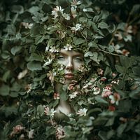 De groene vrouw omringd door bloemen en bladeren. Eén zijn met de natuur. Dit stuk voegt sfeer toe, terwijl het ook zorgt voor interactie.