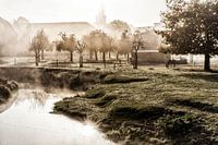 De zon brand de ochtenddauw weg bij de Watermolen van Wijlre in het Zuid-Limburgse Heuvelland (Nederland).