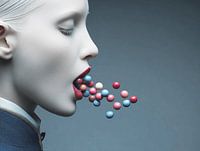 Zijaanzicht van een persoon met zichtbare oorlijn en donkere kraag; naast de schouder zweven een cluster pastelgekleurde dragees (blauw en roze) tegen een zachtgrijze achtergrond — minimalistisch, surrealistisch portret.