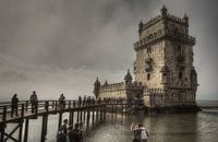 Toeristen op weg naar het kasteel van Belém, nabij Lissabon. Ochtendmist, waardoor een wat spookachtige sfeer ontstaat. Beeld versterkt door HDR toe te passen, en een kleurfilter.