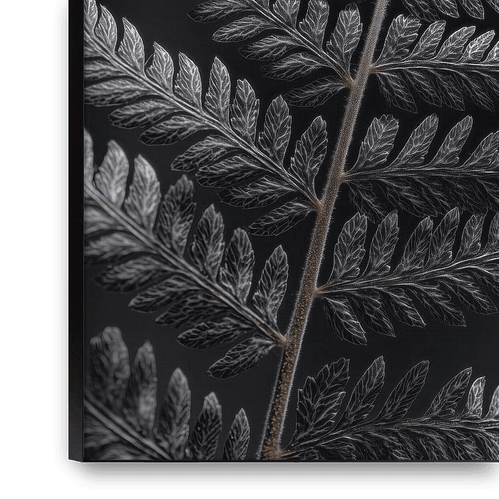 Een close-up van een varenvorm in grijstonen. De fijne lijnen van het blad vormen een helder, symmetrisch patroon tegen een diepzwarte achtergrond.