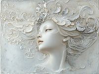 Zilveren Elegance - Dit vrouwen schilderij toont een elegant vrouwengezicht in profiel, geaccentueerd door weelderige, rococo-geïnspireerde zilveren en witte swirls die uit haar haar en de omgeving lijken te stromen en een romantische en etherische uitstraling geven.