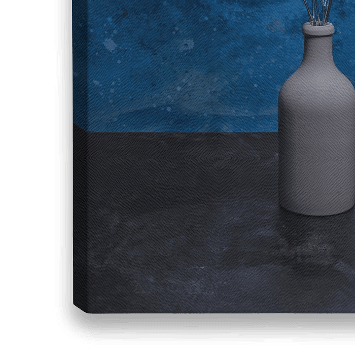 Zilveren Gipskruid in oude grespotjes tegen een blauwe stalen achterwand. Regelmatig maak ik in mijn eigen thuis studio op Texel foto's van stilleven. De attributen zijn gevonden op rommelmarkten, bij een antiekwinkel.