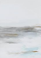 Dit schilderij presenteert een ijle, haast etherische atmosfeer waarin witte en grijze sluiers in elkaar overvloeien. Vage hints van lichtblauw en goud zorgen voor subtiele accenten die het werk tot leven brengen. De compositie doet denken aan een luchtlandschap of ijsvlaktes bij ochtendschemering. De zachte penseelstreken versterken het gevoel van beweging in de lucht of mist die over een vlakte trekt.