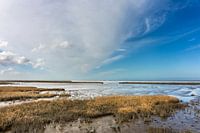 Het licht schijnt zilverachtig op het water van de Waddenzee in de kwelders van Noord-Groningen.