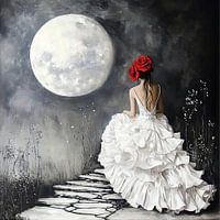 Een vrouw in een prachtige witte kanten jurk en rode rozen in haar haar staat op een stenen pad en kijkt omhoog naar de volle maan.