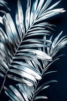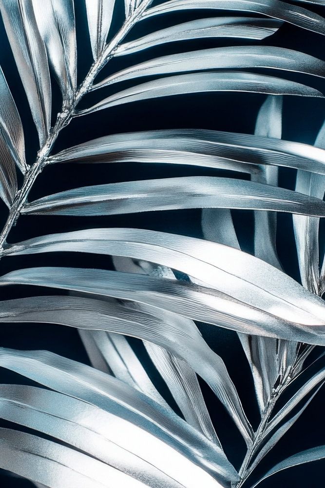 Een vleugje elegantie ontvouwt zich in de glinsterende zilveren bladeren, die delicaat glanzen tegen de diepblauwe achtergrond. Hun gebogen randen en metallic glans geven de compositie een moderne lichtheid, alsof ze zachtjes dansen in de wind terwijl ze een mysterieuze schoonheid uitstralen.