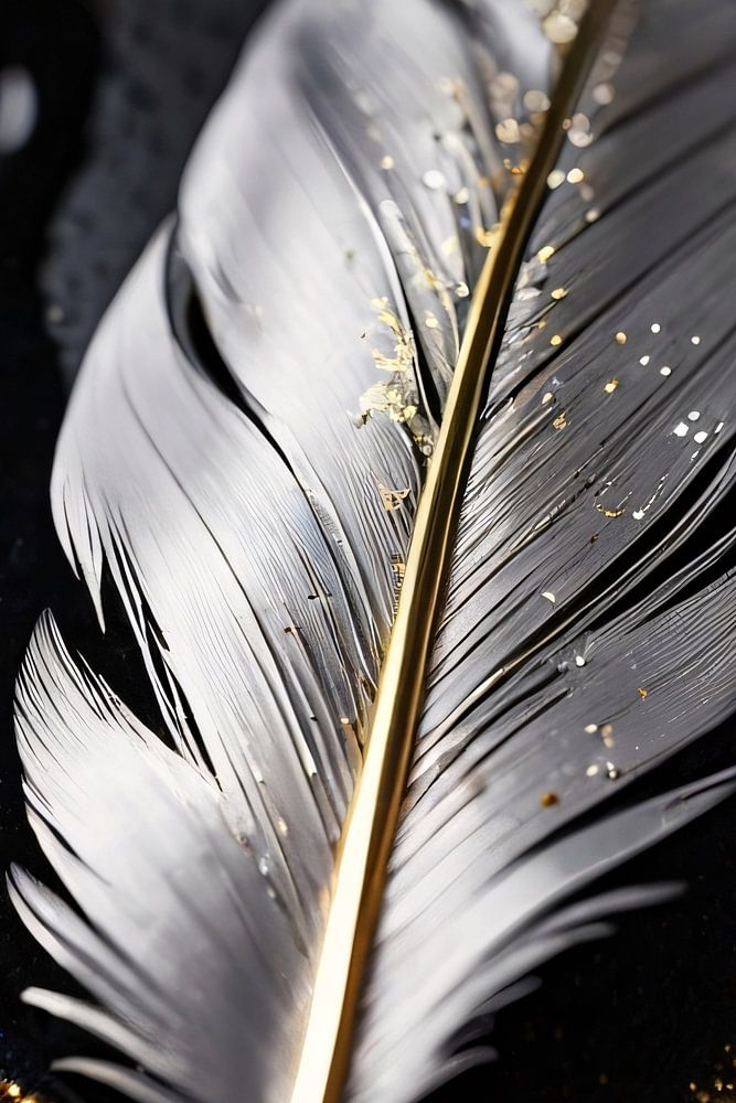 Dit prachtige ontwerp toont een delicate zilveren veer, subtiel geplaatst op een glanzend zwart oppervlak. De fijne details van de veer worden versterkt door het contrast tussen de zachte, glanzende texturen en de sprankelende gouden glitters die eromheen liggen. Deze verfijnde combinatie van zilver, zwart en goud maakt het ontwerp elegant en modern. Ideaal voor een minimalistische of chique interieurstijl, waarbij de combinatie van natuurlijke elementen en luxe materialen een verfijnde sfeer creëert. Perfect voor een kantoor of slaapkamer waar rust en stijl samenkomen. De veer symboliseert lichtheid en verfijning, terwijl het goud een vleugje luxe toevoegt. Dit ontwerp trekt de aandacht en blijft fascineren door zijn eenvoudige maar krachtige uitstraling.