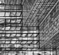 Deze foto is genomen in het gebouw van Beeld en Geluid in Hilversum. De gevel is uitgevoerd in kleurrijk glas. Maar deze zwart wit uitvoering heeft mijn voorkeur.