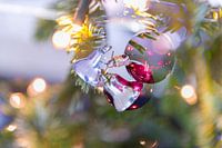 Meervoudig belichte opname van een zilverkleurig kerstklokje en rode kerstbal met lichtjes in de kerstboom.