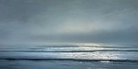 Een verstilde zee strekt zich uit onder een zwaarbewolkte lucht waarin blauwgrijze tinten zacht in elkaar overvloeien. Het licht lijkt van achter de wolken te komen, diffuus en zilverachtig, waardoor het wateroppervlak subtiel begint te glanzen. De horizon is nauwelijks scherp omlijnd; lucht en zee versmelten tot een dromerig geheel dat…