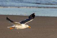 Zilvermeeuw (Larus fuscus) in vlucht op het strand van Juist, Oost-Friese eilanden, Duitsland.