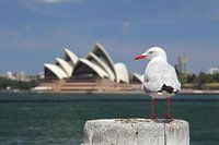 Silver Gull (Chroicocephalus novaehollandiae) in de haven van Sydney, Australië, met op de achtergrond het Sydney Opera House.