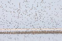 Zilverplevieren in vlucht boven het Wad van Ameland. Grutto's rusten tijdens vloed, springtij