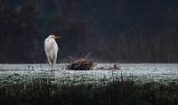 Beeld van een zilver reiger langs de oever op een koude winterse dag.