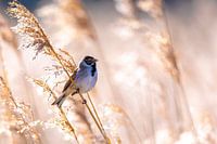 Een rietgors, Emberiza schoeniclus, zingend in het riet op een mooie zonnige dag met tegenlicht.