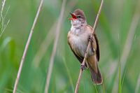 Grote Karekiet (Acrocephalus arundinaceus) uit volle borst zingend in het riet.