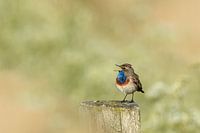 Een blauwborst zingt zijn lied vanaf een houten paal in het landschap. Het voorjaar is begonnen. De blauwborst heeft nu een prachtig blauw gekleurde borst. Zowel de voorgrond als de achtergrond zijn mooi vaag zodat alle aandacht naar de vogel uitgaat. In de achtergrond is fluitenkruid aanwezig.