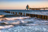 De duikgondel op de pier van Zingst bij zonsopgang. De wind laat de golven tegen de kribben beuken.