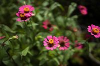 In een weelderige tuin in Sen Monorom onthullen de zinnia's al hun vitaliteit. Hun felroze bloemblaadjes zweven naar het licht, omlijst door groen gebladerte en een paar vleugjes geeloranje. Deze eenvoudige maar opvallende bloemen zijn een echte blikvanger en illustreren de natuurlijke schoonheid van deze bergachtige regio van Cambodja. Sommige zijn in volle bloei, andere uitgebloeid, weer andere nog in knop: een poëtische herinnering aan de cyclus van het leven. Hun gele harten trekken bestuivende insecten aan, die essentieel zijn voor het evenwicht van het lokale ecosysteem. Dit tafereel, badend in natuurlijk licht, inspireert tot rust en verwondering. Niets is statisch, alles is discreet in beweging in dit plantentafereel. Een onderbroken moment, een viering van het leven.