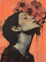 Dit krachtige kunstwerk combineert rauwe emotie met poëtische schoonheid. Een vrouw met gesloten ogen leunt haar gezicht zachtjes tegen een explosie van bloemen, alsof ze zich volledig overgeeft aan geur, herinnering of verlangen. De warme koraalrode achtergrond contrasteert met de donkere contouren van haar silhouet, wat het portret…
