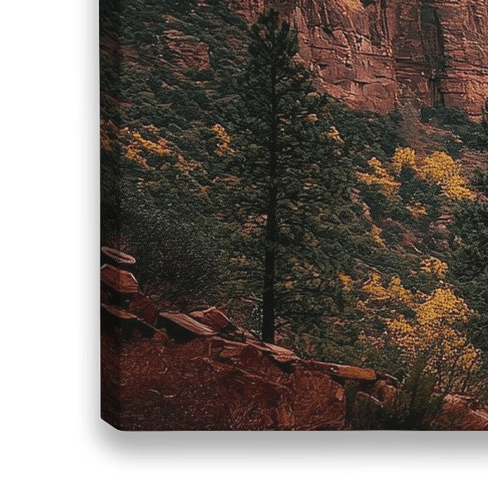 Majestueuze bergen, gehuld in mysterieuze mist, springen onmiddellijk in het oog en voeren je mee naar een wereld van rust. De warme aardetinten harmoniëren perfect met het delicate goud van de herfstbladeren, terwijl de groene dennenbomen voor een frisse wind in de kamer zorgen. Dit indrukwekkende landschap is perfect voor de woonkamer om een uitnodigende, ontspannen sfeer te creëren.