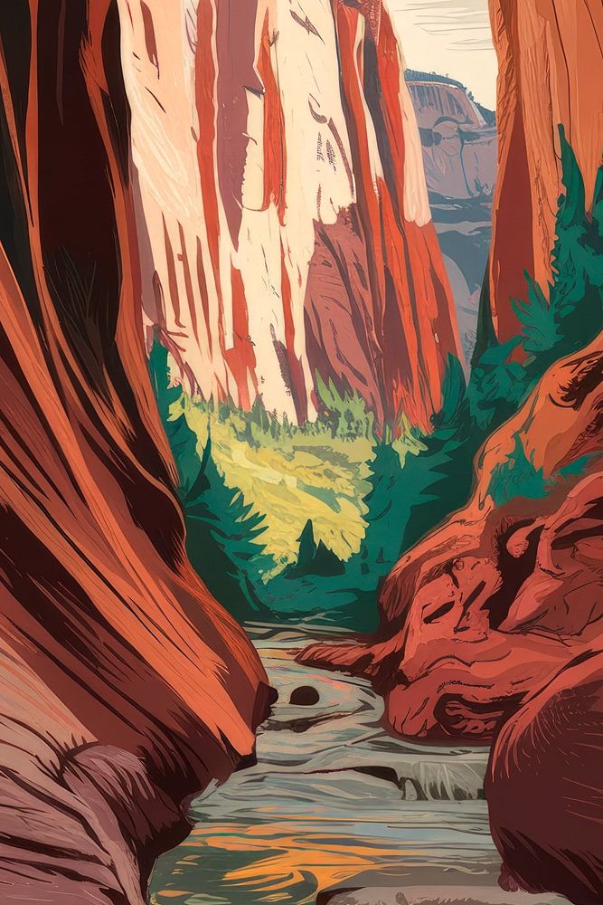 Een majestueus samenspel van rode rotsen en zacht stromend water ontvouwt zich in deze scène die de magie van Zion, Utah vastlegt. Levendige kleuren en opvallende lijnen voegen dynamiek en diepte toe aan de compositie. Dit kunstwerk is ideaal voor de woonkamer en brengt een gevoel van natuur en avontuur in de kamer.