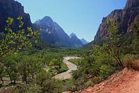De vallei in Zion National Park in Amerika, waardoor de Virgin River stroomt. Omdat het hier een beetje heiig was, zie je de prachtige kleuren en lagen in de bergen.