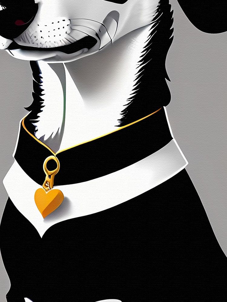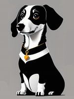 De teckel is geportretteerd in zwart wit met enkele gekleurde accenten.