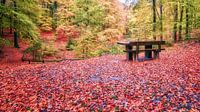 een beeld van het Speulder- en Sprielderbos in de noordelijke Veluwe tijdens de herfst periode. Hier op beeld tijdens de regen het bekende Solse Gat met een picknicktafel tussen de gekleurde herfstbladeren.