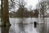 Twee witte metalen bankjes in het park langs de IJssel bij Deventer staan onder water omdat de uiterwaarden zijn ondergelopen.