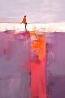 Zittend Meisje | Meisje Oranje - Dit is een abstract schilderij met een klein meisje in een oranje jurk die op een hoge rand zit, omringd door paarse en roze tinten terwijl de lucht zachtjes blauwachtig is.