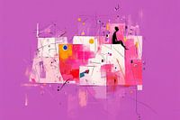 Zittend Persoon | Persoon op Kleurvlak - In dit abstract schilderij zie je een silhouet van een persoon die stil zit op een kleurrijke achtergrond van roze, met opvallende details in geel, blauw en andere levendige kleuren.