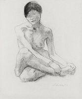 Ets met een naaktmodel. De vrouw zit bloot op de grond en van de meid zijn benen, torso en tiet zijn ontbloot.