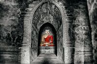 Zittende boeddha in tempelcomplex Bagan Birma Myanmar. Foto zwart/wit, boeddha in kleur.