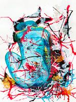 De basis voor dit schilderij zijn de gekleurde vlekken. Daaroverheen heb ik de naakte zittende vrouw geschilderd in de kleur turquoize. Daarna ben ik verder gegaan met de abstracte vlekken. Ik heb verschillende soorten verf, potlood en krijt gebruikt, maar het meest acrylverf. Dit schilderij past in een modern interieur, maar het thema van de naakte vrouw geeft het schilderij een klassiek tintje.