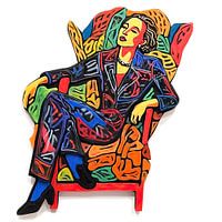Dit moderne kunstwerk toont een vrouw die ontspannen zit in een stoel.