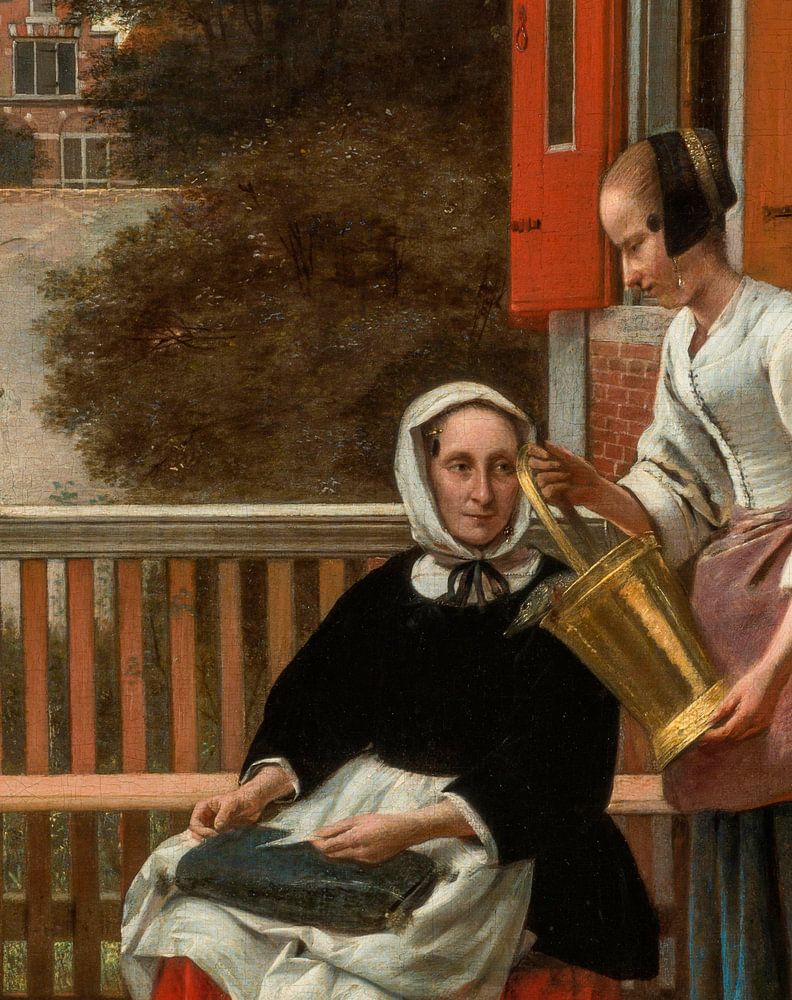 Zittende vrouw met dienstmeid op een binnenplaats, Pieter de Hooch (circa 1657-1659)