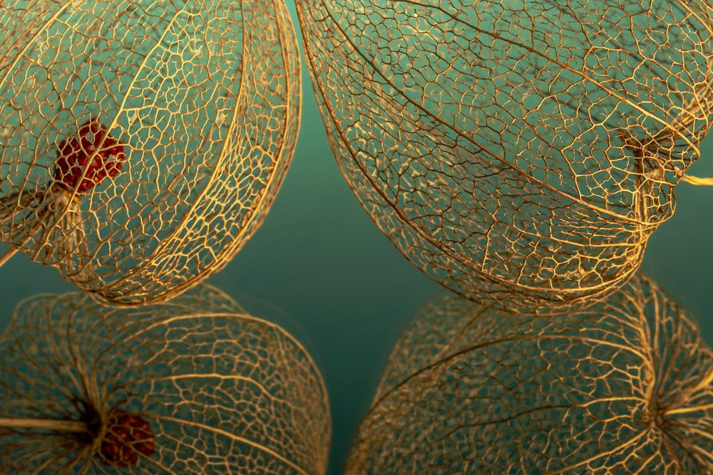 "Zo leeg van binnen: 2 lampionnetjes met petrol - turquoise achtergrond" is een foto van twee lampionnetjes van de lampionplant die al bijna verteerd zijn. Het geraamte van de nerven zijn hierdoor mooi te zien. Op de turquoise - petrol kleurige ondergrond (met verloop van licht naar donker) is de reflectie te zien van het lampionnetje. Door het warme licht wat op de lampionnetjes straalt, krijgt het werk een warme een gezellige chique uitstraling. De lampionnetjes lijken wel van goud te zijn!