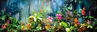 Tropische orchideeën gedijen in een prachtige verscheidenheid te midden van het weelderige regenwoud. Het kleurrijke en harmonieuze beeld dat zich ontvouwt, ademt een dromerige sfeer en presenteert zich als een uiterst decoratief spektakel.