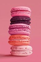 Een elegante stapeling van perfect uitgevoerde macarons in verschillende tinten roze en paars, gefotografeerd tegen een zachte roze achtergrond. De compositie straalt verfijning uit met zijn subtiele kleurverloop van lichtroze naar koraal en diep paars, waarbij de karakteristieke textuur van de macarons prachtig tot zijn recht komt in…